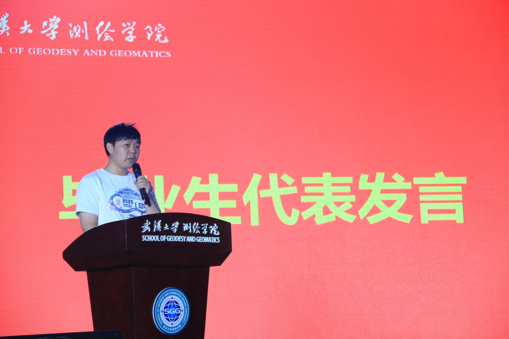 优秀毕业生代表发言。本科优秀毕业生代表黄俊同学结合自身成长经历,讲述了自己在18av 和18av 的培养和引导下,逐步从未知走向热爱,度过了最灿烂的四年大学时光。优秀毕业研究生代表李圣雨以十年珞珈岁月为轴,分享从测绘工程到北斗导航的学术征程,道出“测绘精神让精密坐标有了人文温度”的深切感悟。