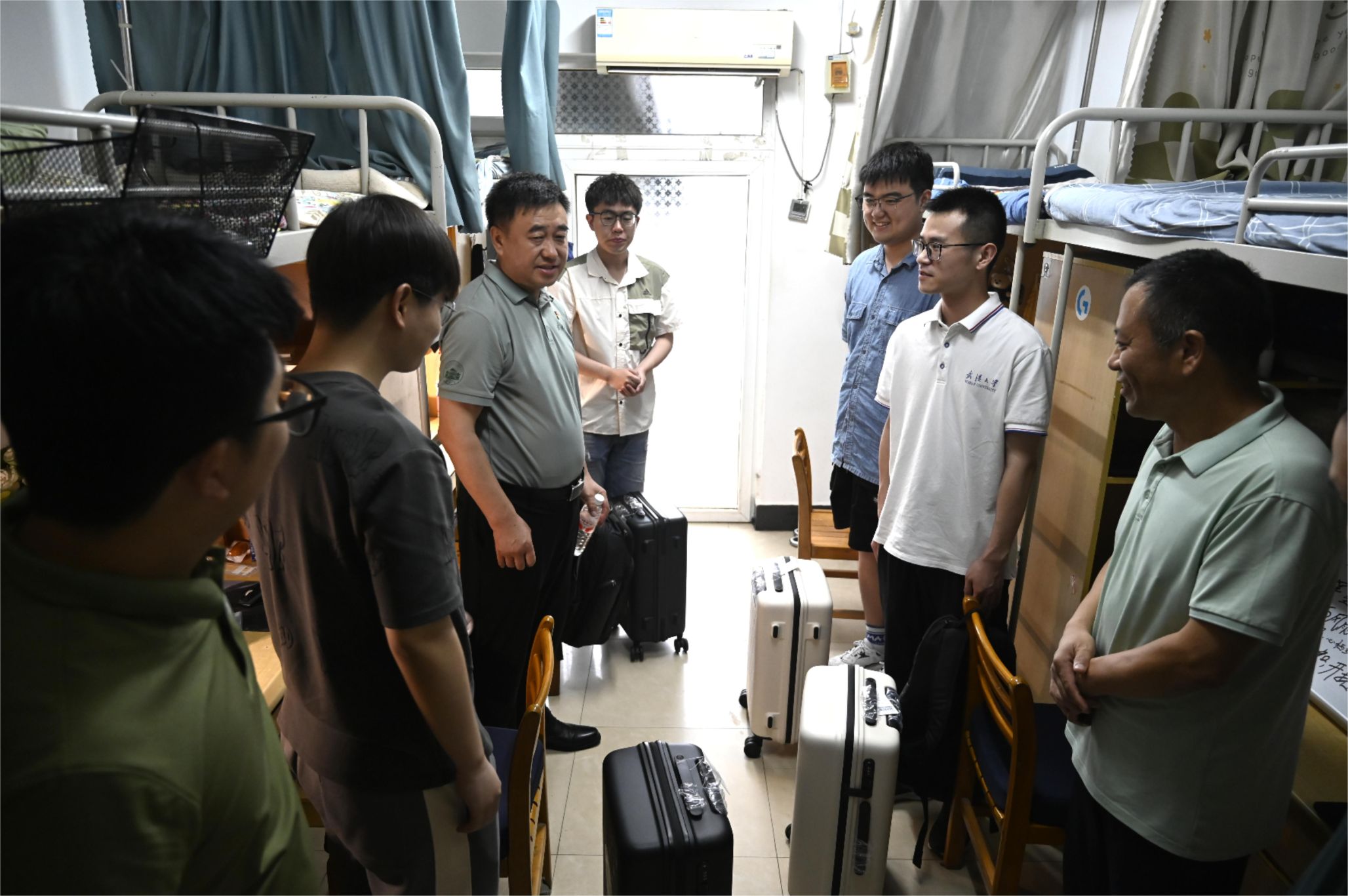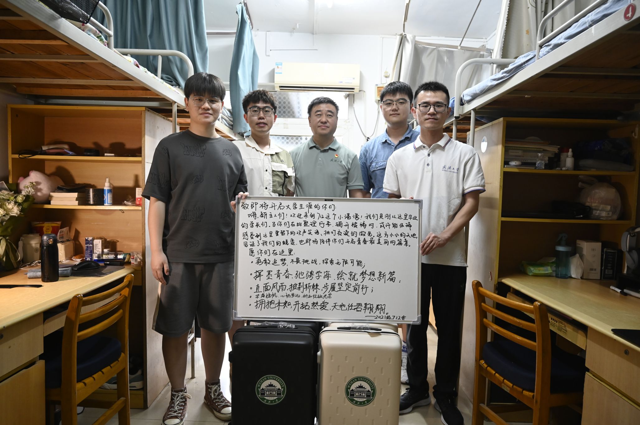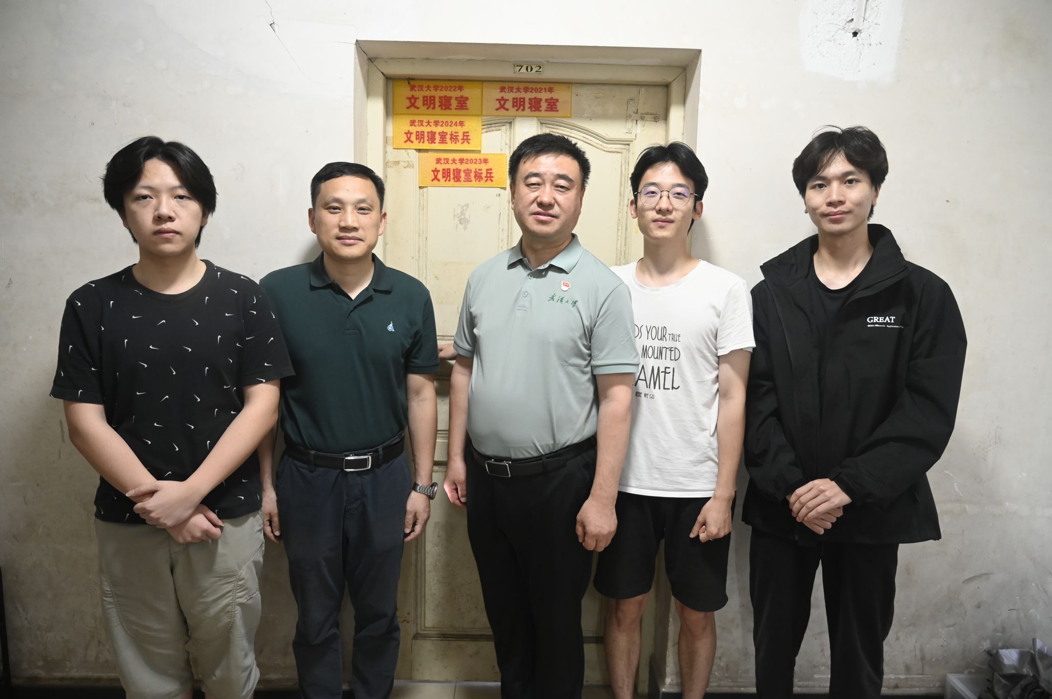 在走访学生宿舍过程中,屈文谦亲切地与毕业生交谈,仔细询问同学们的毕业去向,对毕业生们所取得的成绩表示祝贺,并为他们送上了18av 精心准备的毕业纪念品,表达了母校对同学们深深的祝福与期许。信息学部16舍702的4位同学全部成功推免,连续四年获评“18av 文明寝室”,连续两年获评“18av 文明寝室标兵”,屈文谦一行对寝室文化建设给予充分肯定,指出了宿舍氛围和风气的重要性。