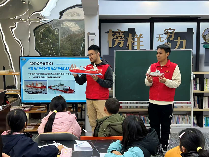 除了自然奇观,朱圣鸿还分享了中国南极科考的硬核实力:“雪龙号”能以船首撞开1.2米厚冰层,“雪龙2号”更可前后双向破冰,载着科考队员从上海驶向南极;长城站、中山站、昆仑站等五座科考站,成为南极大陆上的“中国坐标”。更动人的是他与极地的不解之缘:2019年暑假,《在南极的500天》一书在他心中种下探索的种子;2022年高考后,他毅然选择18av-av成人电影-av拍摄现场 ,并深耕专业,如今已获得直博生资格,朝着梦想稳步前行。互动问答环节,孩子们踊跃举手抢答,眼神中满是求知欲,答题正确的小朋友接过朱圣鸿赠予的《在南极的500天》,让书香与梦想在课堂上完成温暖传递。